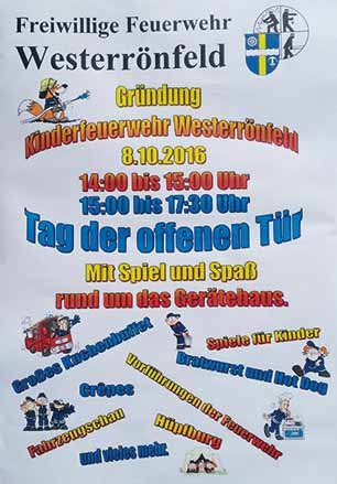 ![]() Gründungsfest der Kinderfeuerwehr im feierlichen Rahmen. Anschließend ein „Tag der offenen Tür“ mit allem was gut ist für Kopf und Bauch. Ein Angebot der Freiwilligen Feuerwehr |